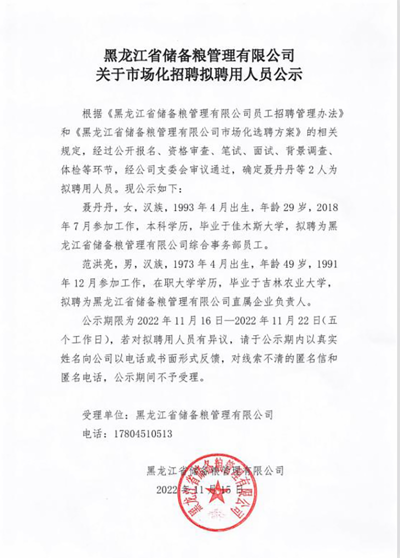 黑龙江省储备粮管理有限公司关于市场化招聘拟聘用人员公示