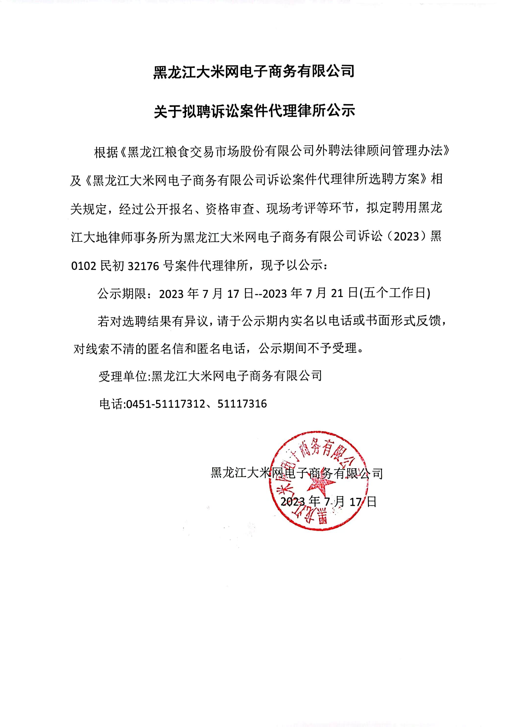 黑龙江大米网电子商务有限公司关于拟聘诉讼案件代理律所公示
