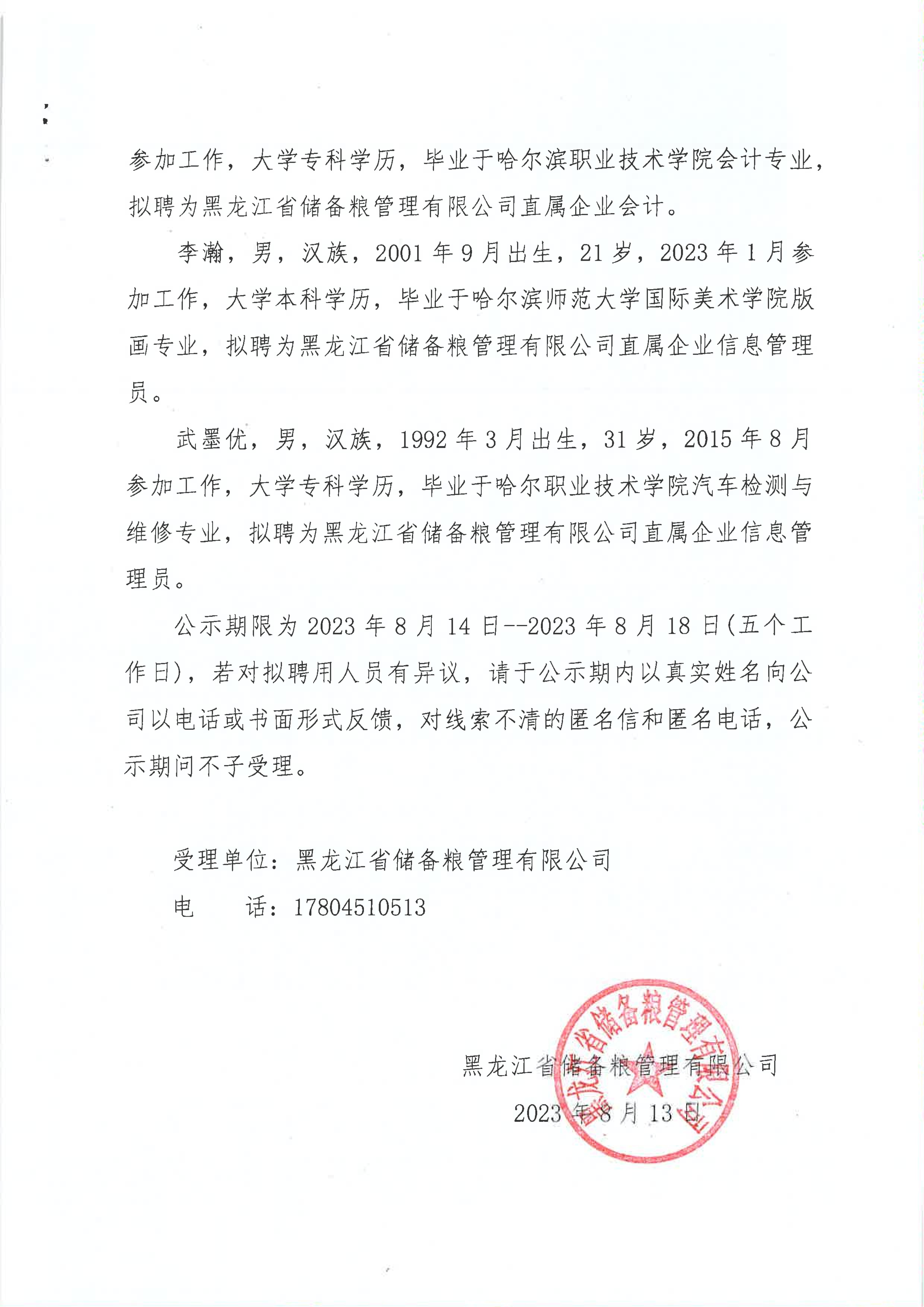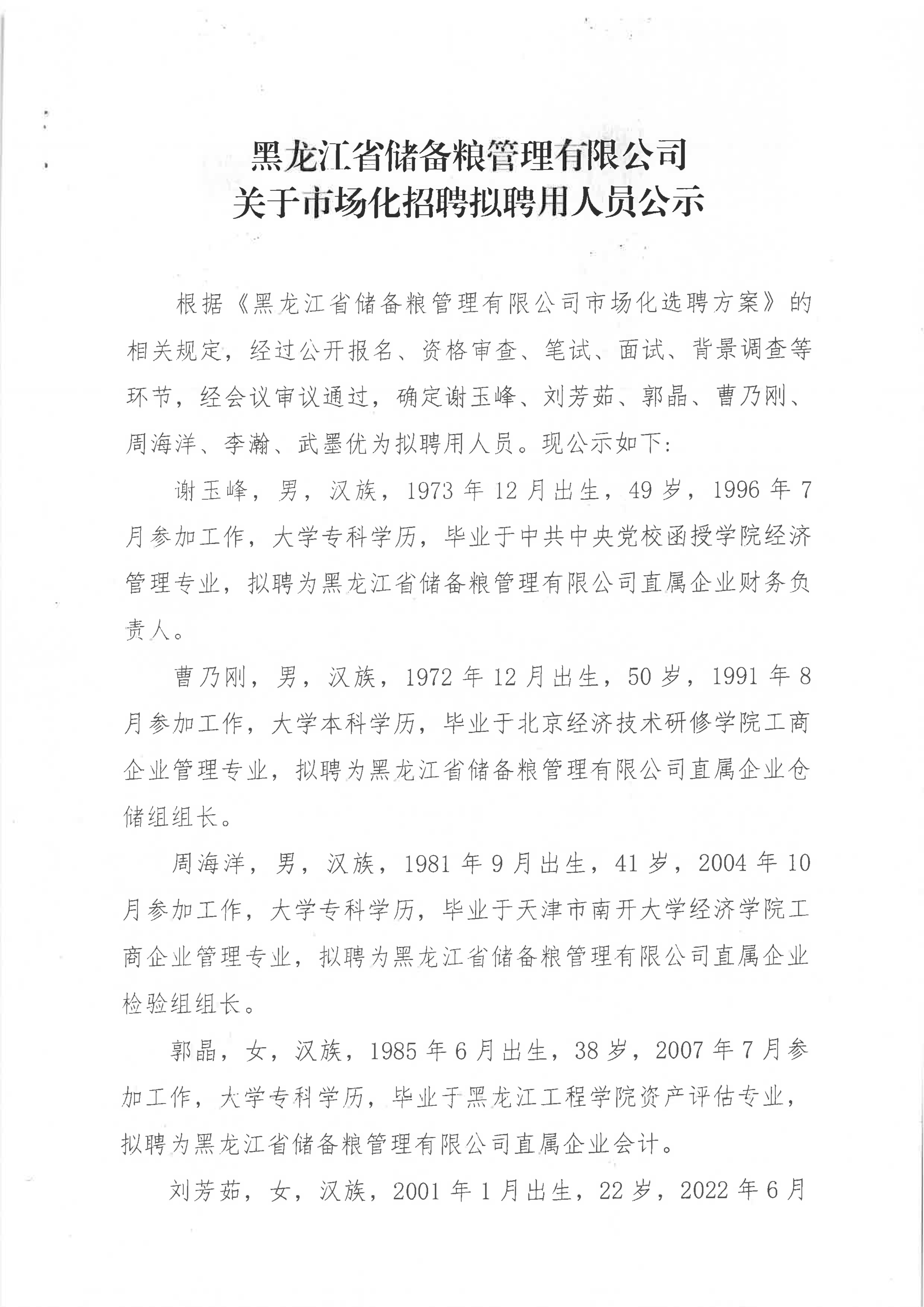 黑龙江省储备粮管理有限公司关于市场化招聘拟聘用人员公示