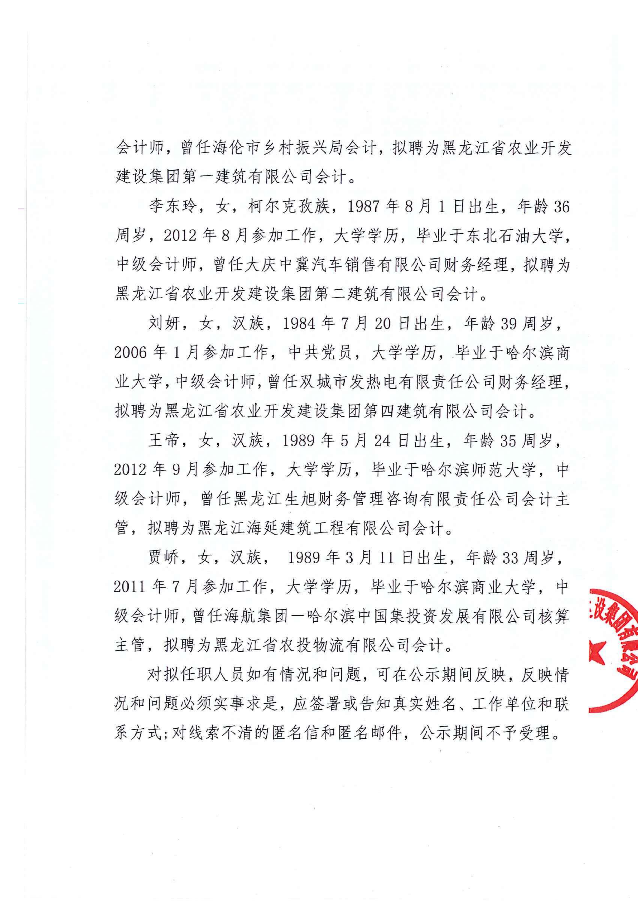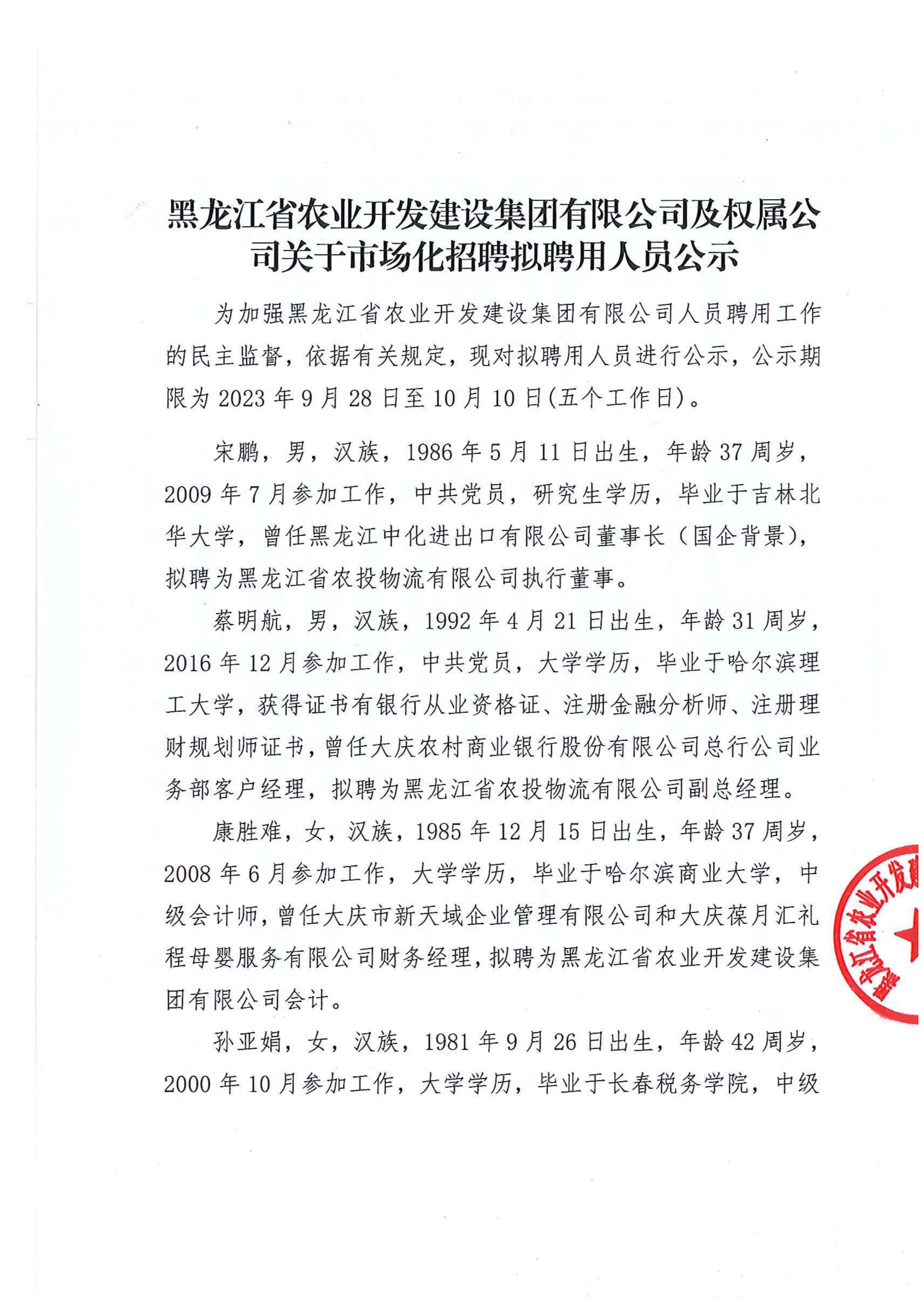 黑龙江省农业开发建设集团有限公司及权属公司关于市场化招聘拟聘用人员公示