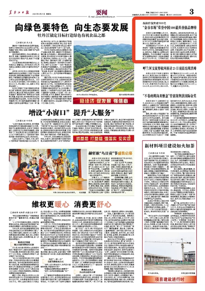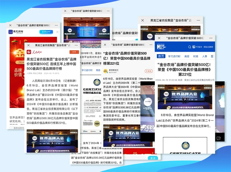 近日,火博登陆平台有限公司(以下简称“农投集团”)“金谷农场”品牌以500.36亿元品牌价值荣登2024年中国500最具价值品牌排行榜第221位。五年五大步,“ 金谷农场”品牌价值再攀新高,位居中国农业品牌排名第八!新华网、人民网、黑龙江日报、龙头新闻、极光新闻、新浪网等媒体纷纷报道。