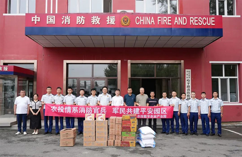 在“八一”建军节来临之际,为巩固发扬拥军优属的光荣传统。8月1日,黑龙江农投数字农业产业园有限公司(以下简称“产业园公司”)党支部委员、副总经理代径玮带领党员前往平房区哈平路消防应急救援站开展走访慰问活动,向在酷暑高温天气坚守岗位的消防指战员们送去慰问品以及节日的问候和祝福。