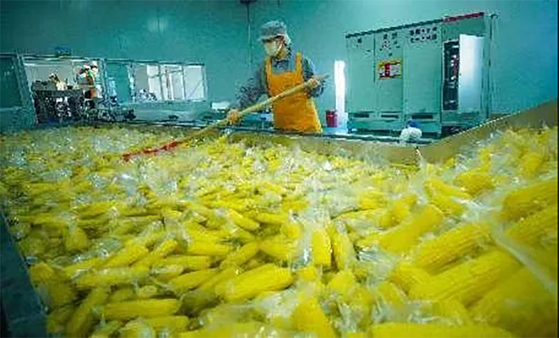 国庆期间,因为农产品行业的特殊性,龙疆金谷人无法休息,工厂里,新鲜采摘的甜玉米堆满操作间,生产车间满是鲜甜玉米诱人的甜香,工人们穿着统一工装,在各项加工设备前进行着操作。鲜玉米通过机械传送带进入加工流水线,在经过脱皮、分拣、蒸煮、消毒、清洗等多道工序后最终成为待售的鲜玉米。