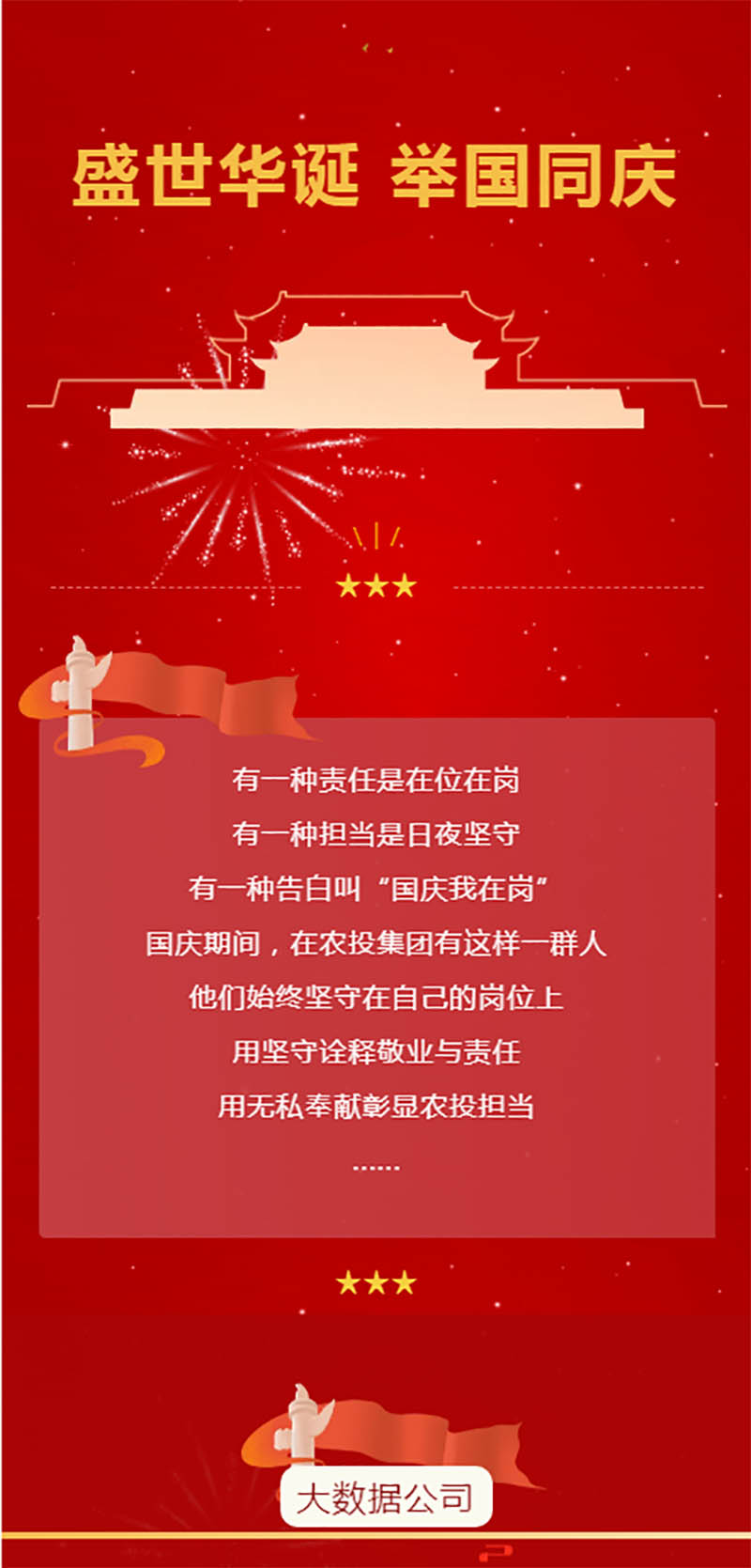 金秋十月,丹桂飘香。国庆期间,大数据公司全体员工深知肩上的责任与担当,秉持 “专业服务,创新引领,科技赋能” 的理念,随时待命、闻令而动,以更加昂扬的斗志、更加敬业的精神、更加高效的行动,不断推动科技与农业的深度融合,为实现乡村振兴、农业现代化的宏伟目标贡献自己的力量。