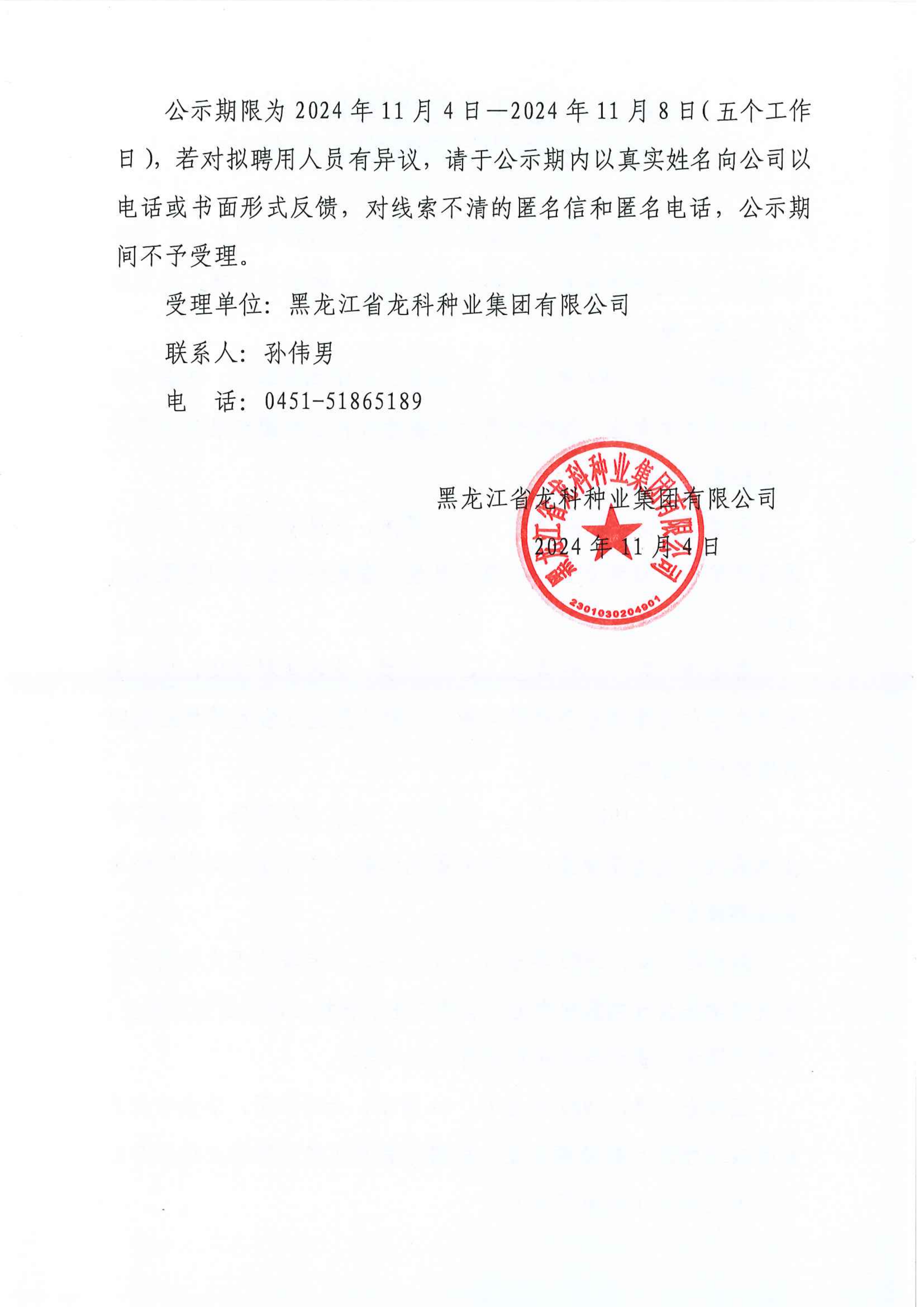 黑龙江省龙科种业集团有限公司关于市场化招聘拟聘用人员公示