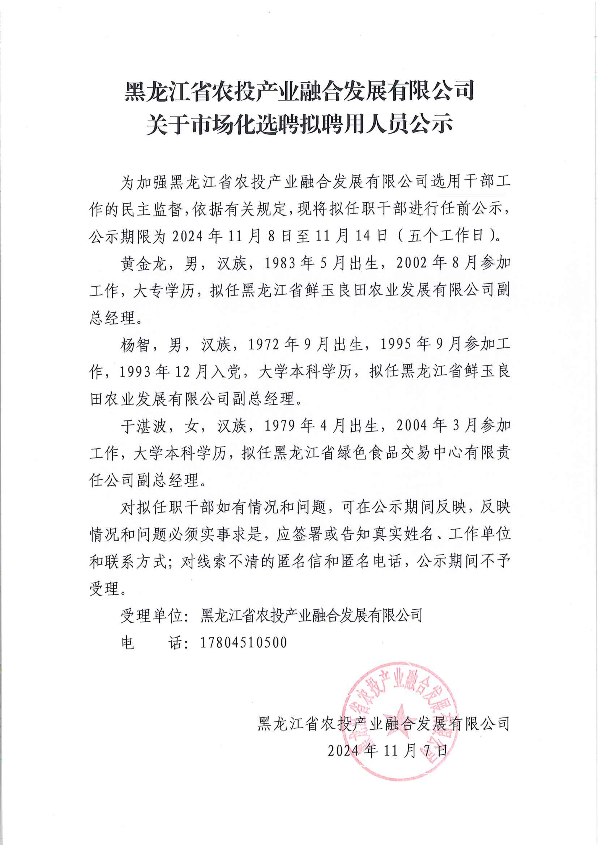 黑龙江省农投产业融合发展有限公司关于市场化选聘拟聘用人员公示