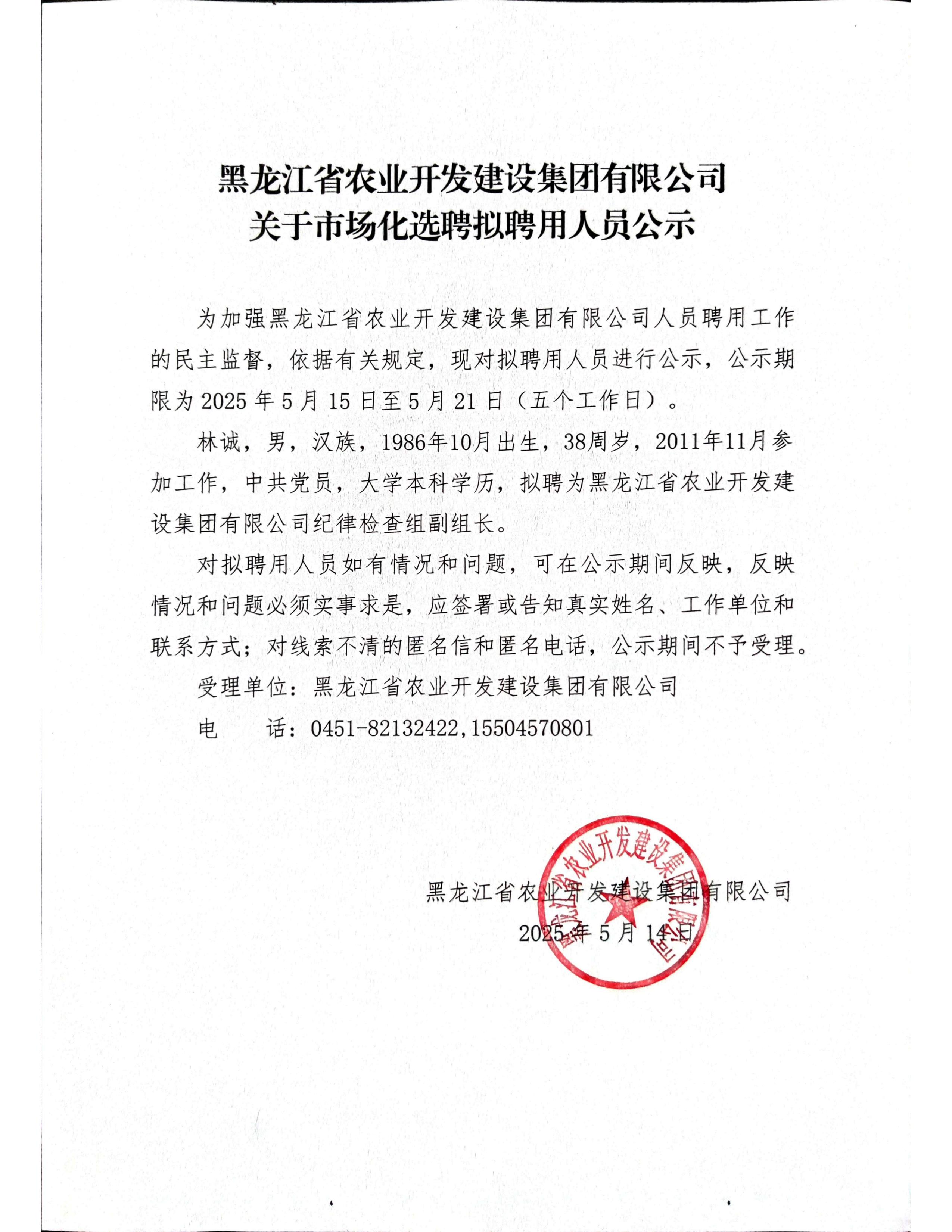 黑龙江省农业开发建设集团有限公司关于市场化选聘拟聘用人员公示