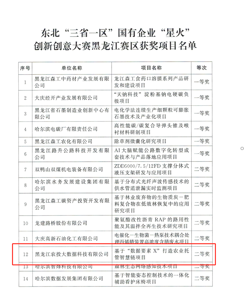 东北“三省一区”山水相连、人文相亲、产业相融,国资国企发展资源优势和条件机遇相似,在科技创新合作有着深厚基础。 2024年11月至2025年4月,辽宁省国资委、吉林省国资委、黑龙江省国资委、内蒙古自治区国资委联合举办了东北“三省一区”国有企业“星火”创新创意大赛,“三省一区”的161个项目分获一、二、三等奖。农投大数据公司凭借“基于‘数据要素×’打造农业托管智慧链项目”从全省百余个参赛项目中脱颖而出,荣获大赛二等奖。