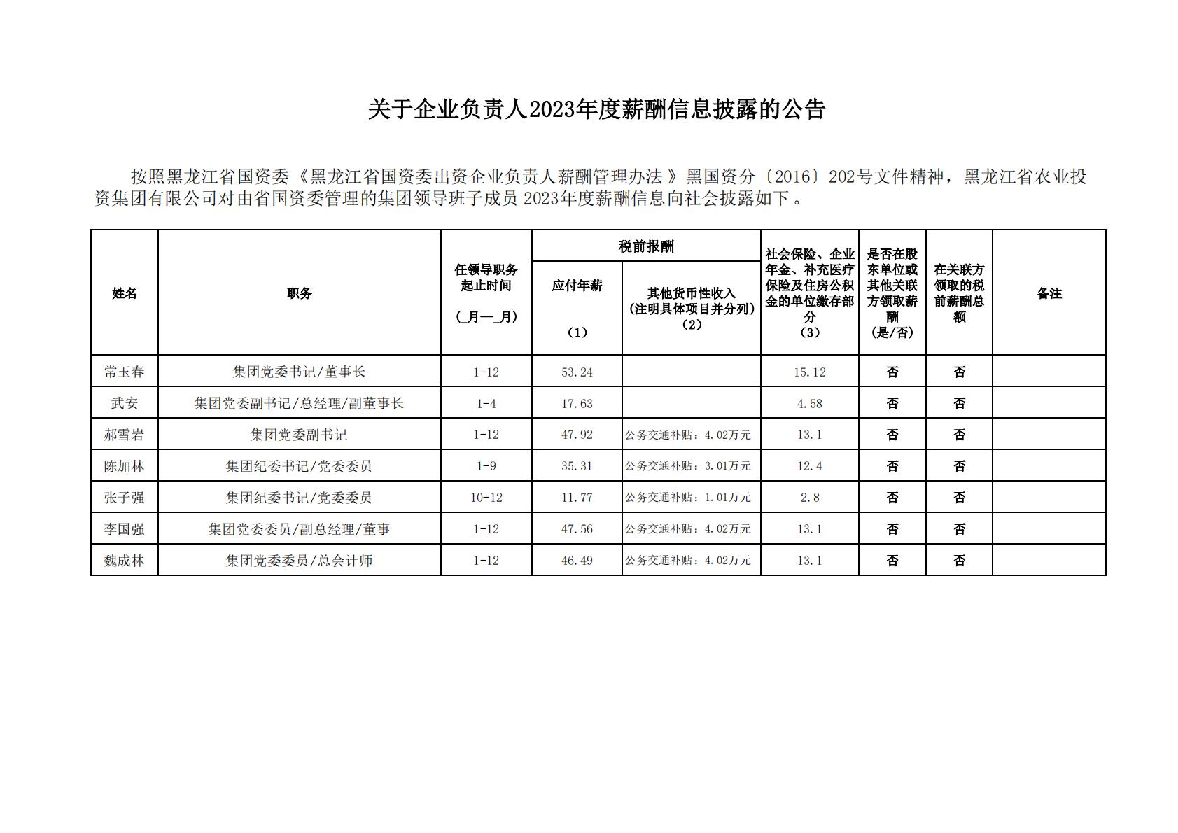 关于企业负责人2023年度薪酬信息披露的公告