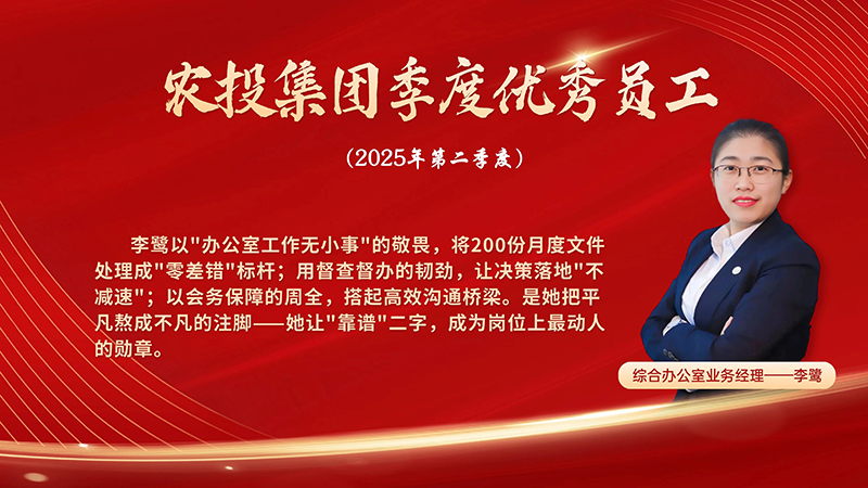 为表彰先进,树立典型,有效激发农投集团总部全体员工的工作热情、主动性和创造力,农投集团总部对季度优秀部门和优秀员工开展评选工作。集团党委组织部(人力资源部)被评为集团总部2025年第二季度“优秀部门”、综合办公室(党委办公室、董事会办公室、总经理办公室)业务经理李鹭被评为集团总部2025年第二季度“优秀员工”。