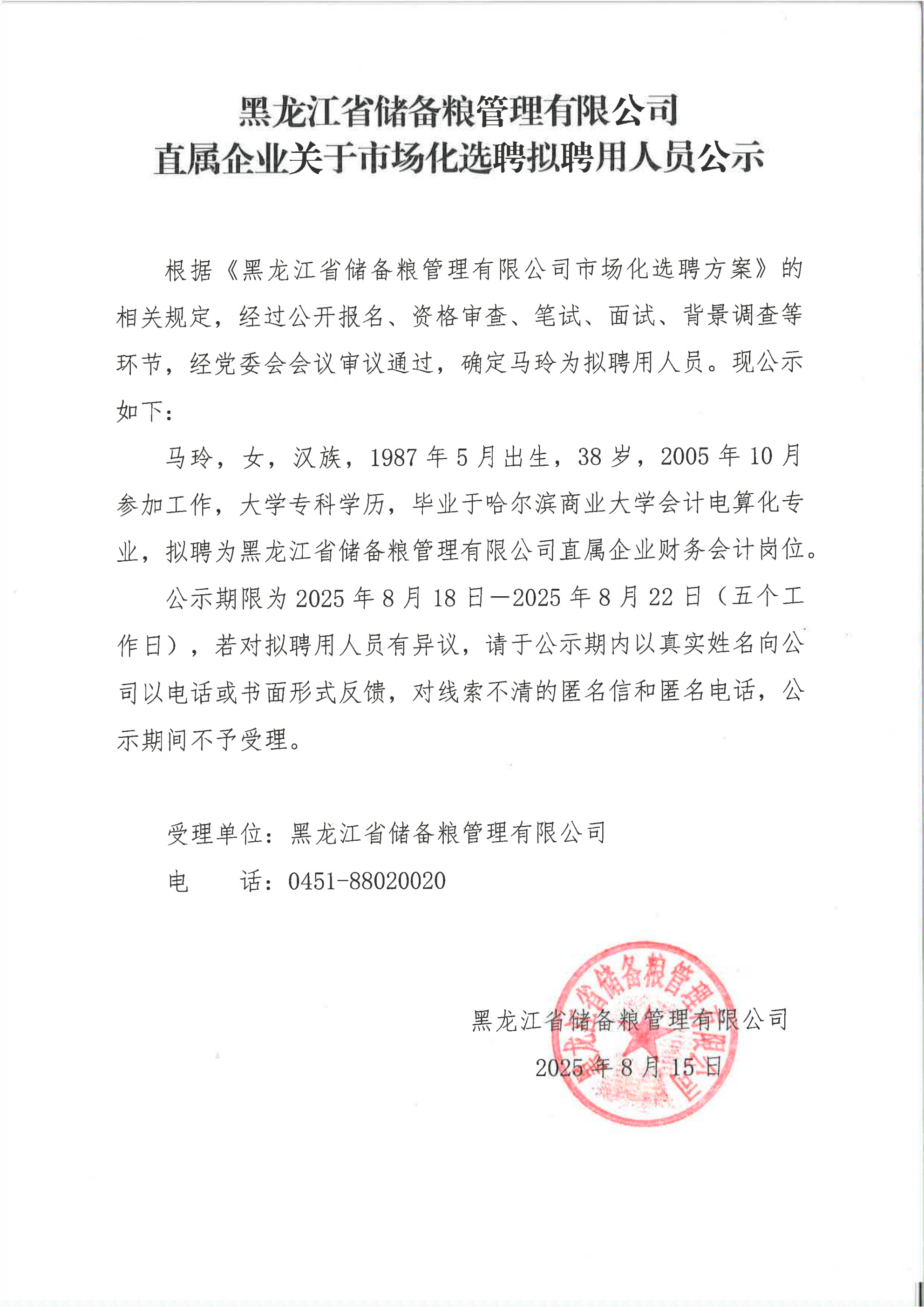 黑龙江省储备粮管理有限公司直属企业关于市场化选聘拟聘用人员公示
