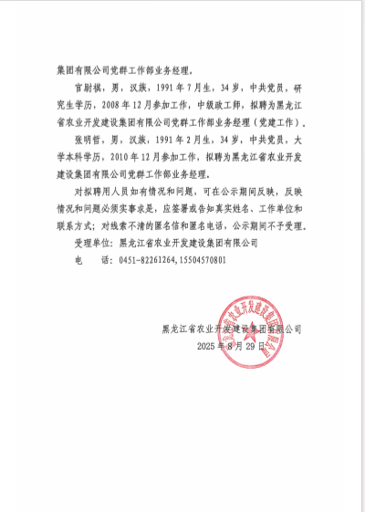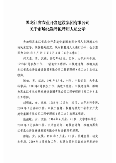 黑龙江省农业开发建设集团有限公司关于市场化选聘拟聘用人员公示